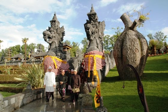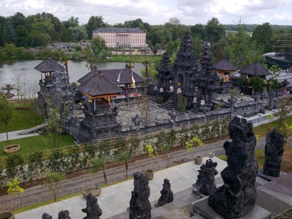 Miniature of Prambanan and Borobudur Temple, exactly-same-sized Balinese castle Puri Agung Shanti Buwana, traditional houses of Indonesia's Provinces, and all other Indonesia's cultures, sculptures, some fossils, and traditional buildings placed on five hectares area. Still can't imagine that? Just remember a famous park at Eastern Jakarta, Taman Mini Indonesia Indah (TMII). But the whole thing is now moved to Belgium (and of course not exactly the same with the original one).