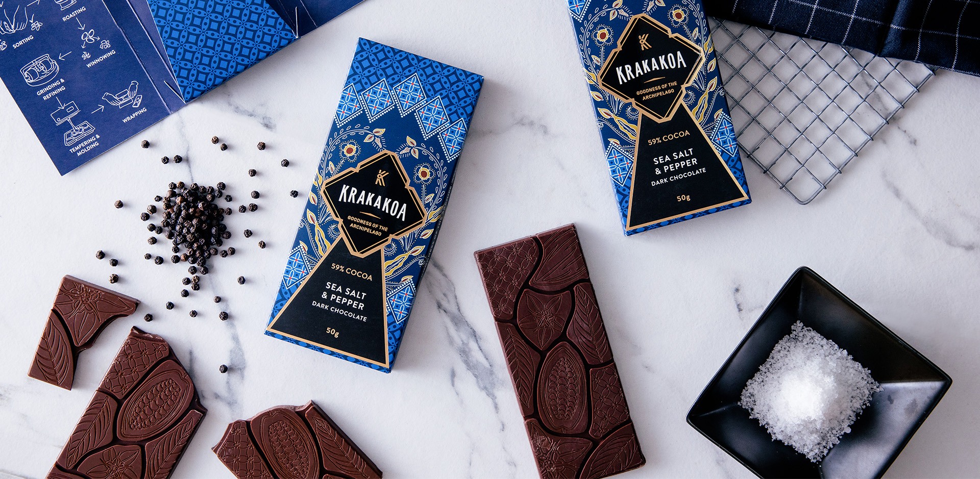Krakakoa menyajikan cokelat dengan kandungan dark chocolate yang beragam dari 45 % sampai 100% serta berbagai varian rasa seperti sea salt and papper, ginger, dark chocolate chilli, dark milk chocolate cinnamon dan creamy coffee.