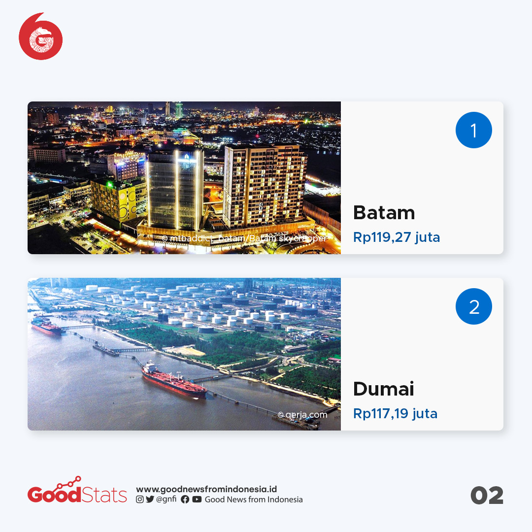 Dua kota di Provinsi Riau dan Kepulauan Riau lain menempel diposisi keempat dan kelima. Pekanbaru yang berstatus sebagai ibu kota Provinsi Riau berhasil mencatatkan nominal sebesar Rp104,17 juta tepat satu tingkat di atas Tanjung Pinang yang mencatatkan PDRB per kapita senilai Rp95,31 juta.