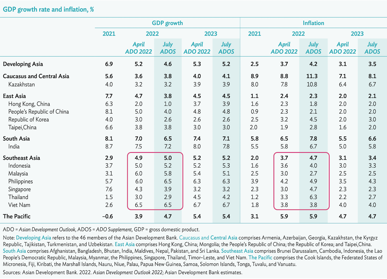 Revisi pertumbuhan dalam edisi tambahan dari publikasi ternama ADB tersebut selaras dengan naiknya proyeksi pertumbuhan Asia Tenggara. Untuk kawasan ini, ADB memproyeksikan pertumbuhan 2022 sebesar 5 persen, naik 0,1 persen dari proyeksi April (4,9 persen).