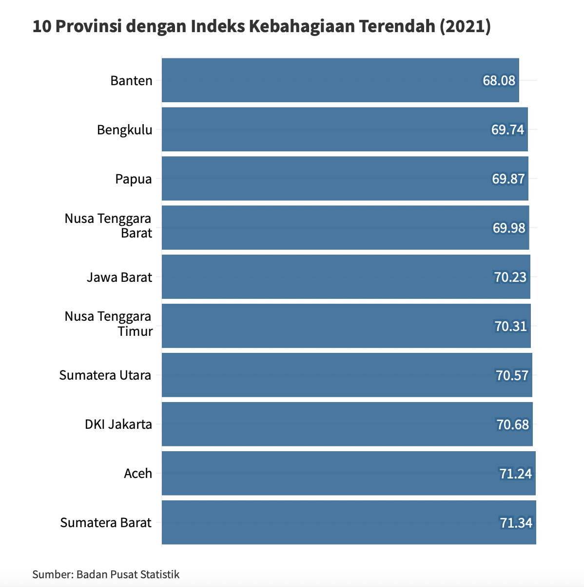 Data tahun 2021 menyebutkan bahwa Banten menjadi provinsi dengan indeks kebahagiaan terendah dengan nilai 68,08, kemudian di atasnya ada Bengkulu dengan nilai 69,74 dan Papua 69,87.
