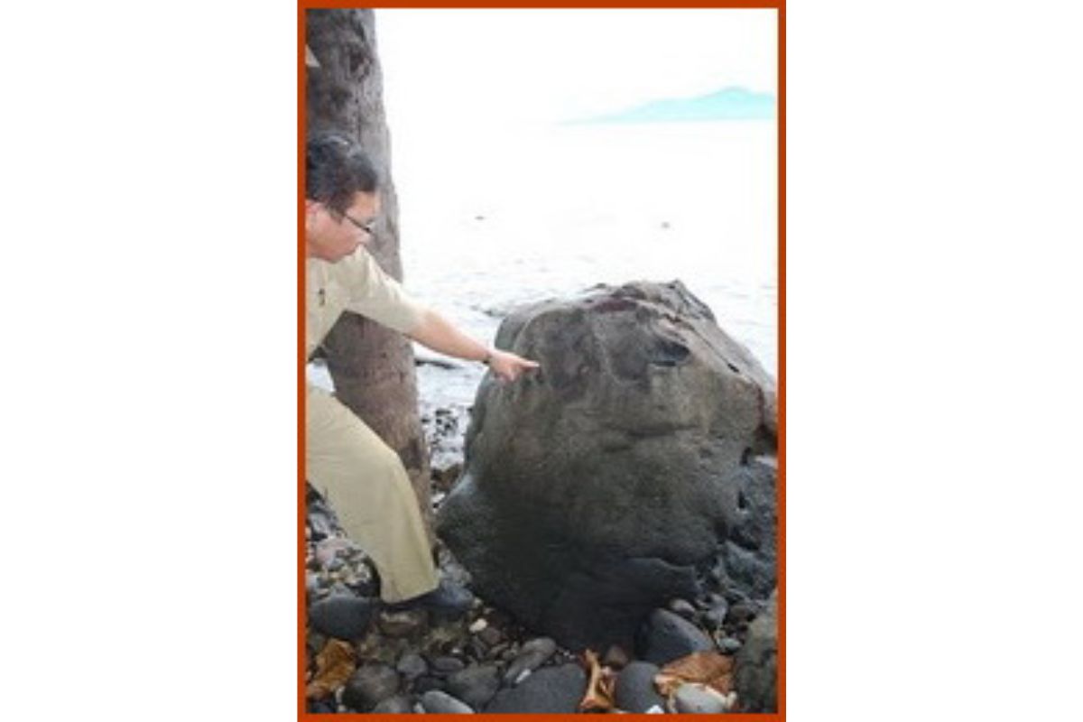 Di pesisir Pantai Malalayang, teronggok batu setinggi sekitar satu meter. Sekilas tidak ada yang aneh dari batu itu. Namun jika diperhatikan lebih dekat, batu tersebut memiliki bekas telapak kaki.
