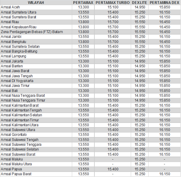 Pertamina hanya menaikkan dua jenis BBM di atas, sedangkan yang lain justru turun atau tidak berubah sama sekali. Harga pertamina dex merosot dari Rp16.850 per liter menjadi Rp15.850. Dexlite juga turun menjadi Rp14.950 per liter dari yang sebelumnya Rp16.150.