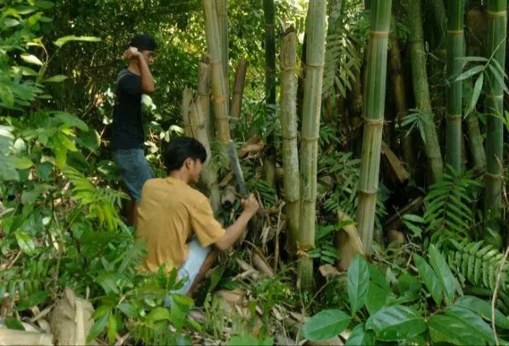 Setelah sampai di sekitar tempat acara biasanya pohon pinang tersebut ditempatkan dibawah lamban langgakh ( rumah panggung ) untuk dikupas kulitnya dan dan haluskan permukaannya. Setelah halus maka rombongan bujang akan dikumpulkan lagi untuk mencari bambu. Bambu tersebut akan dibuat melingkar dengan tujuan akan digunakan untuk menggantung buah - buah ( hadiah ) pinang yang berupa pakaian dan perabotan rumah tangga.