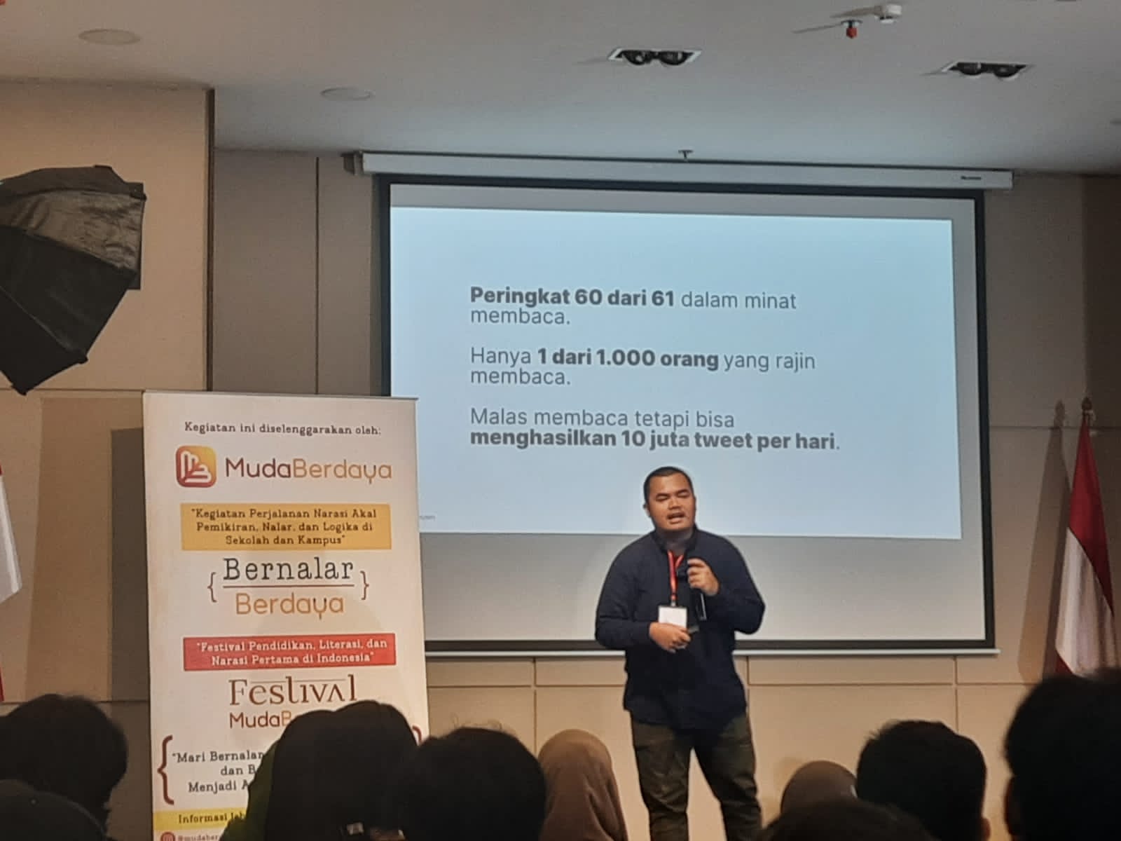 Ahwy mengawali paparannya dengan data mengenai minat baca masyarakat versus keaktifan di media sosial. Diketahui bahwa Indonesia menempati peringkat ke-60 dari 61 negara dalam urusan minat baca. Dari 1000 orang Indonesia, hanya 1 yang rajin membaca.