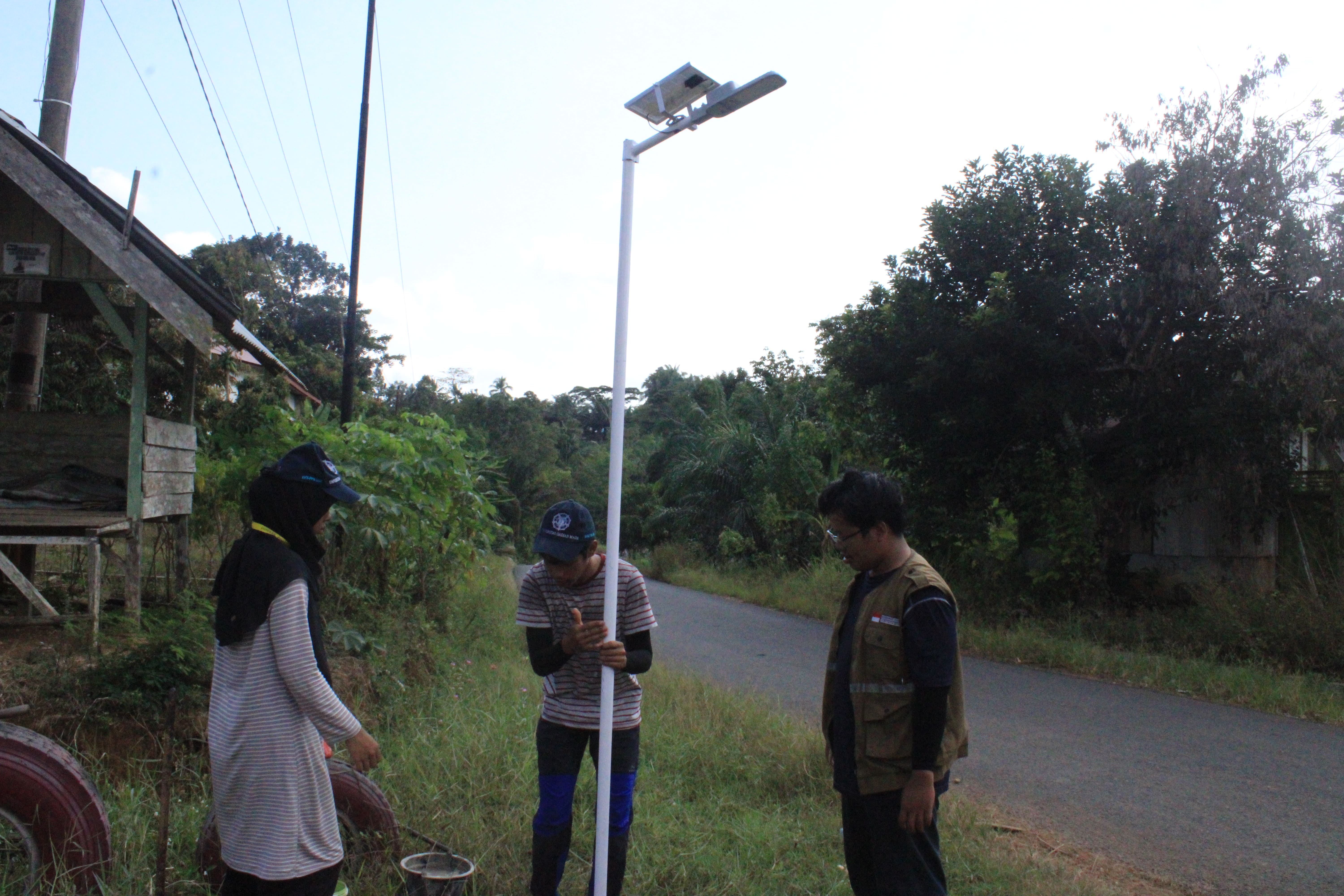 Instalasi: Tim kemudian memasang sistem lampu surya di tiang-tiang yang telah dipersiapkan. Instalasi ini mencakup penempatan panel surya di posisi yang optimal, pemasangan baterai, serta pemasangan lampu LED di tiang-tiang yang telah disiapkan di area yang ditargetkan.