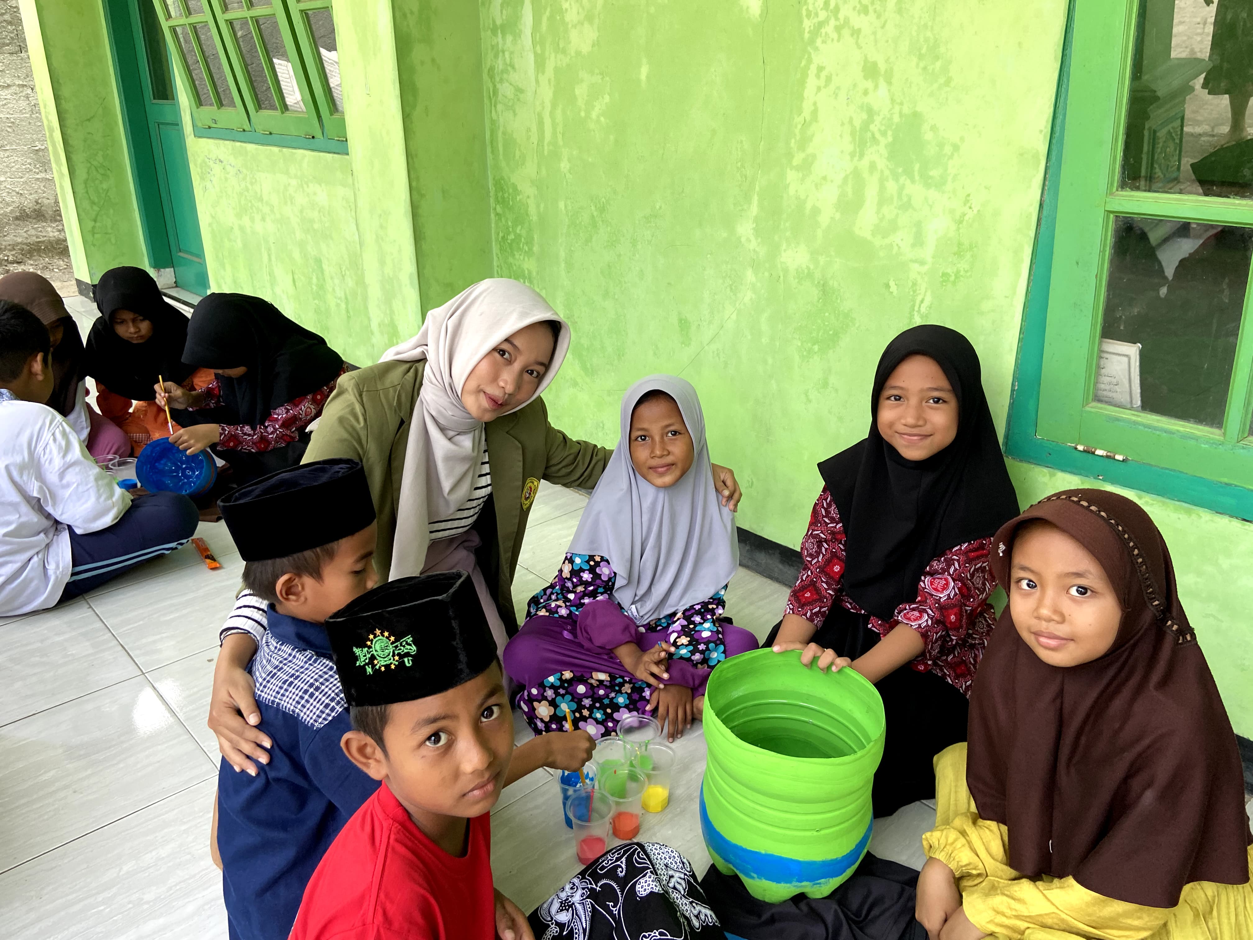 Dengan bantuan mahasiswa, anak-anak belajar menghias pot dari galon bekas, menjadikannya karya seni yang unik tanpa menghilangkan fungsi aslinya. Kreativitas mereka terpancar saat menggambar dan mewarnai pot.